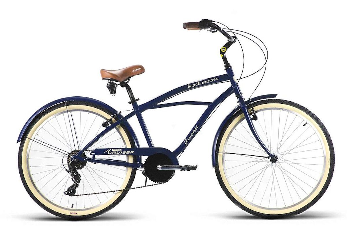 - Diseño beach cruiser: cuadro de acero con curvas suaves, barra baja para subir y bajar con facilidad y conducción erguida. Disponible en celeste y azul marino, con detalles crema en cubierta y sillín marrón.