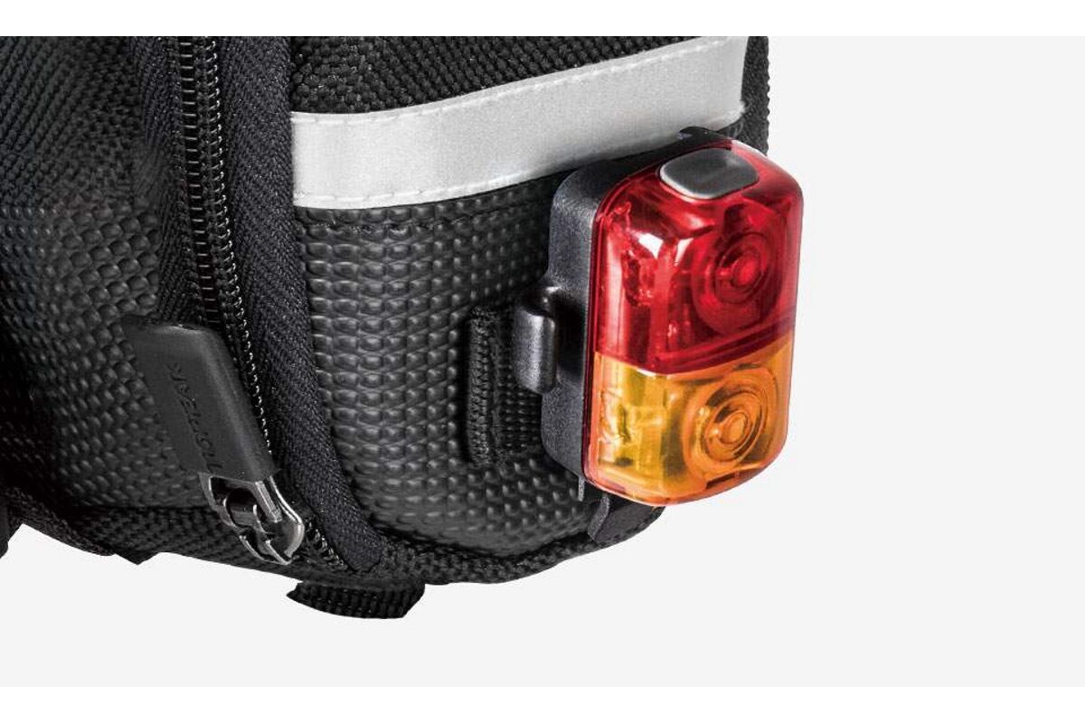 En las versiones mediana y grande, el espacio cubierto por la cremallera esconde un pliegue que permite ampliar la capacidad de la bolsa. Incorpora detalles reflectantes y una correa de soporte para luz trasera.