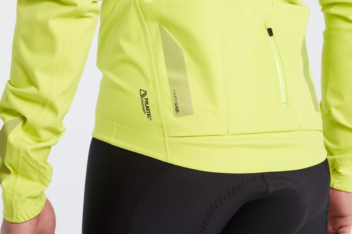 - Hyper Green Polartec® Neoshell® se combina con detalles reflectantes únicos para aumentar drásticamente su visibilidad para los automovilistas las 24 horas del día.