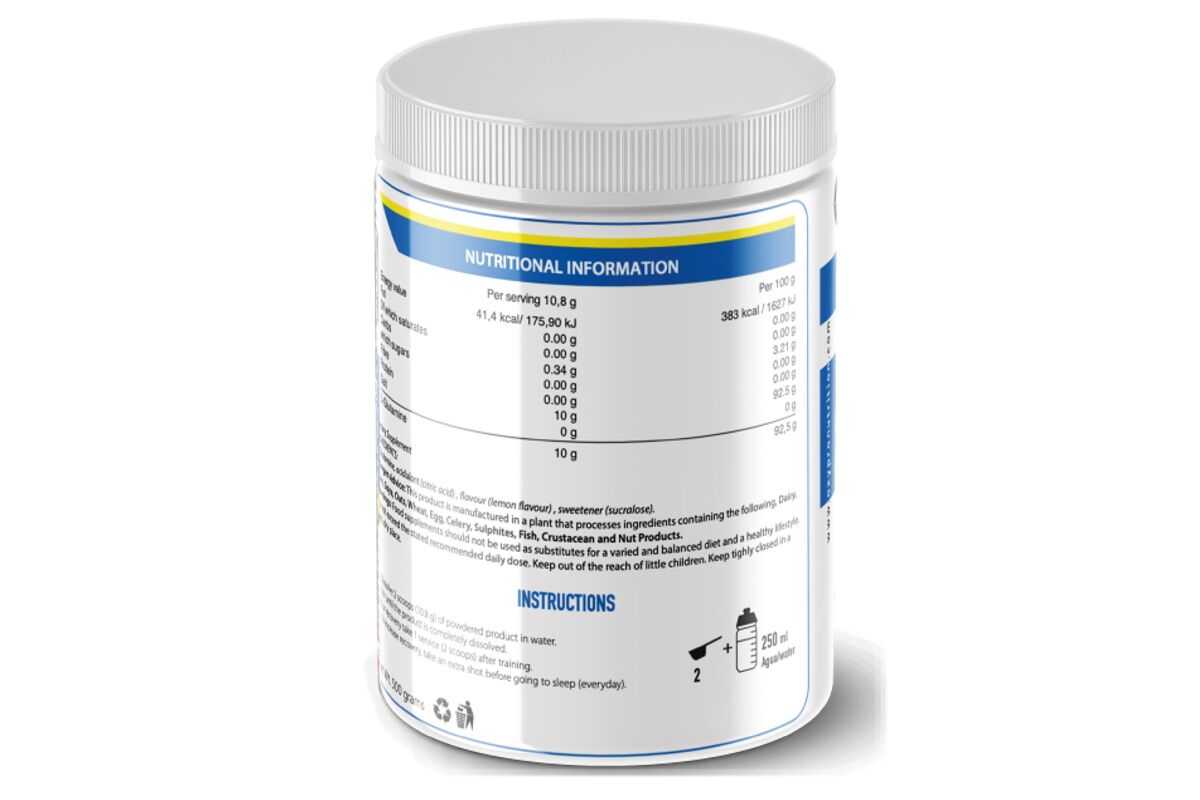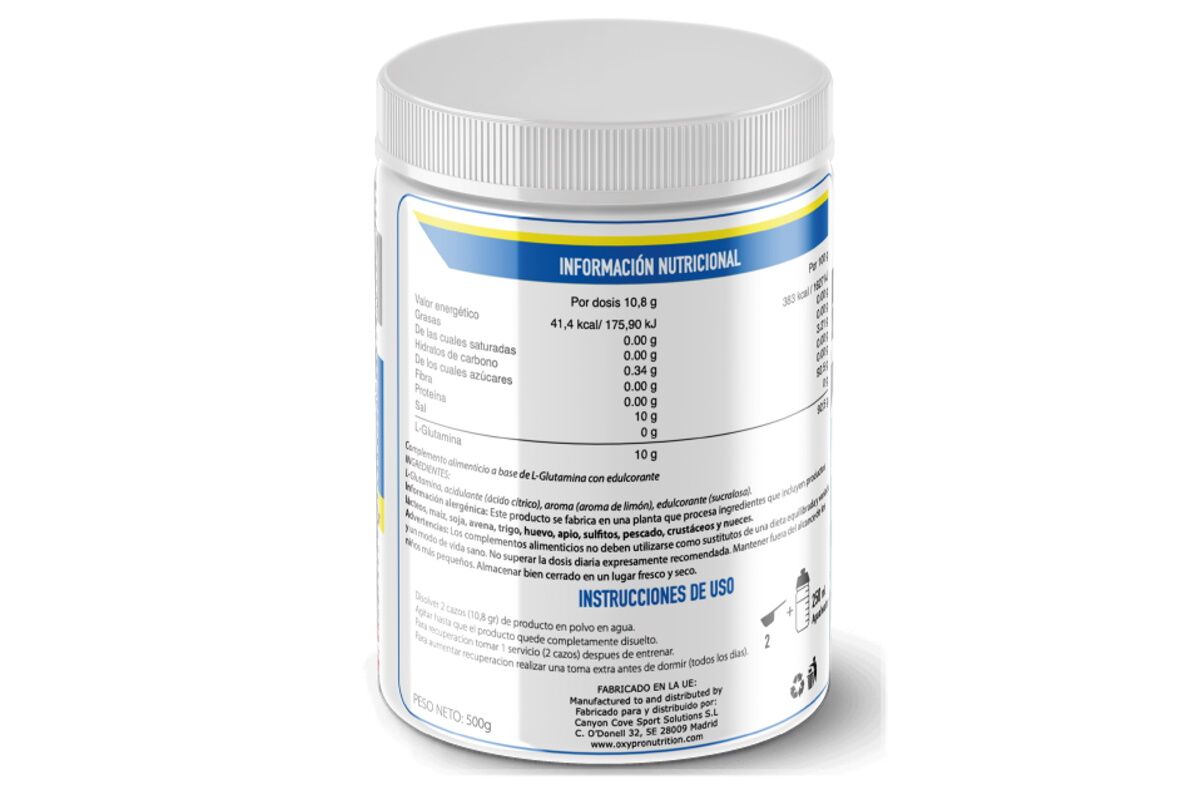 L-Glutamina, acidulante (ácido cítrico), aroma (aroma de limón), edulcorante (sucralosa).
