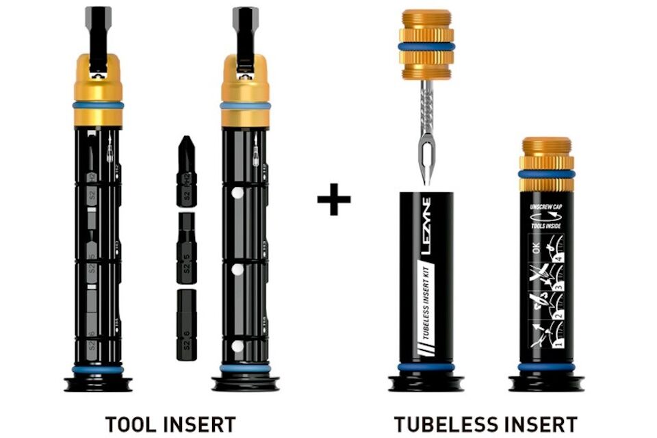 El kit de inserción doble es el mejor juego de herramientas para bicicletas de montaña que se monta de forma discreta, y cuenta con un par de nuestras innovadoras herramientas que se ocultan de forma discreta y segura en los extremos del manillar: el kit de inserción sin cámara y el kit de inserción de herramientas.