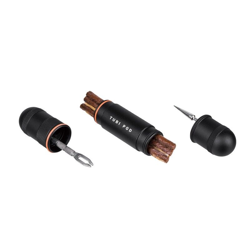 kit de reparación para neumáticos Tubeless muy minimalista. Las herramientas de reparación están integradas en las tapas de los extremos de la cápsula que cuentan con superficies que ofrecen un agarre adicional al reparar el neumático. Todo el kit se guarda dentro de una cápsula de aleación mecanizada.