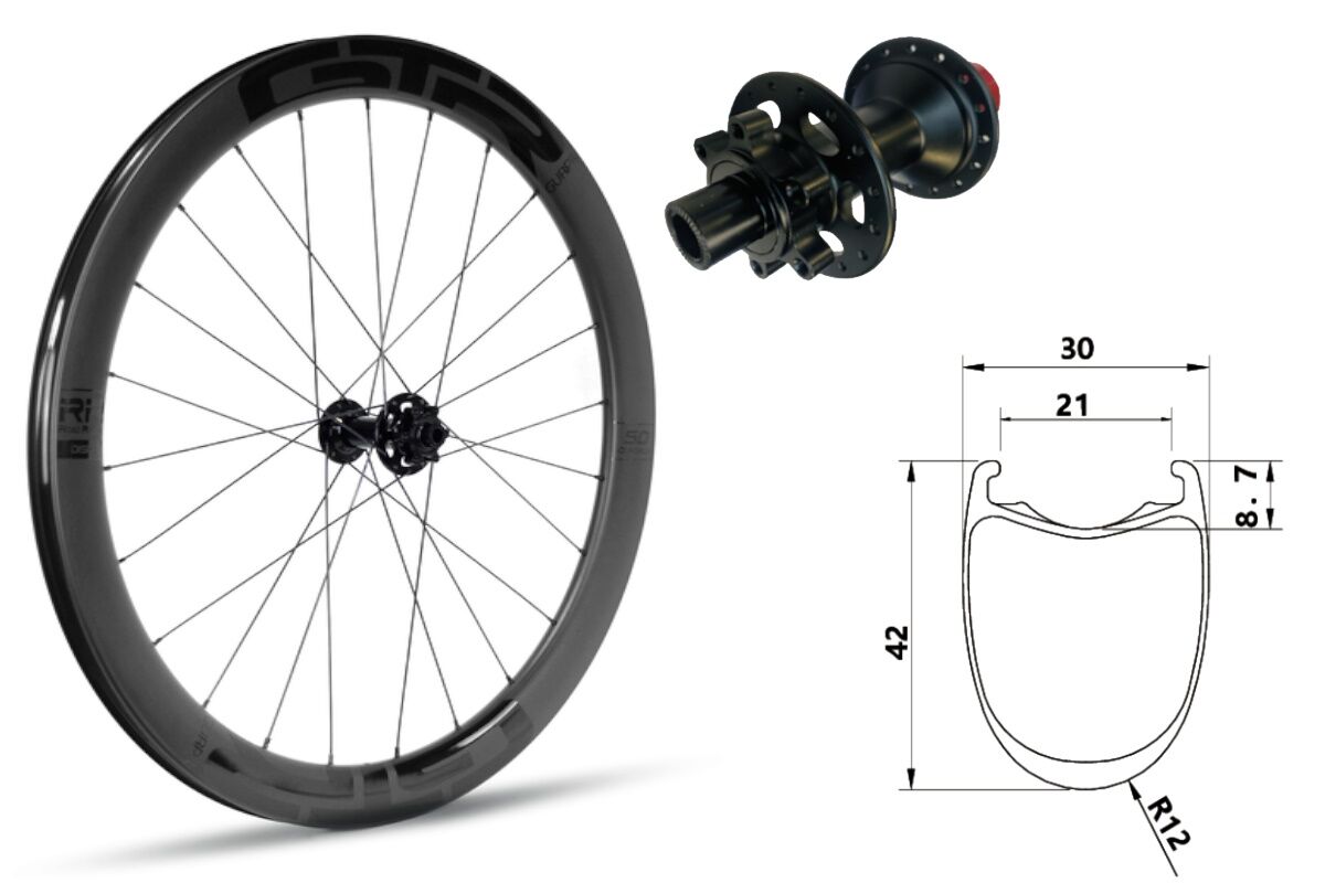 - Llanta: Carbono UD Tubeless Ready negro mate con adhesivos blanco brillante. Perfil: 42mm de altura, 21mm interior y 30mm exterior