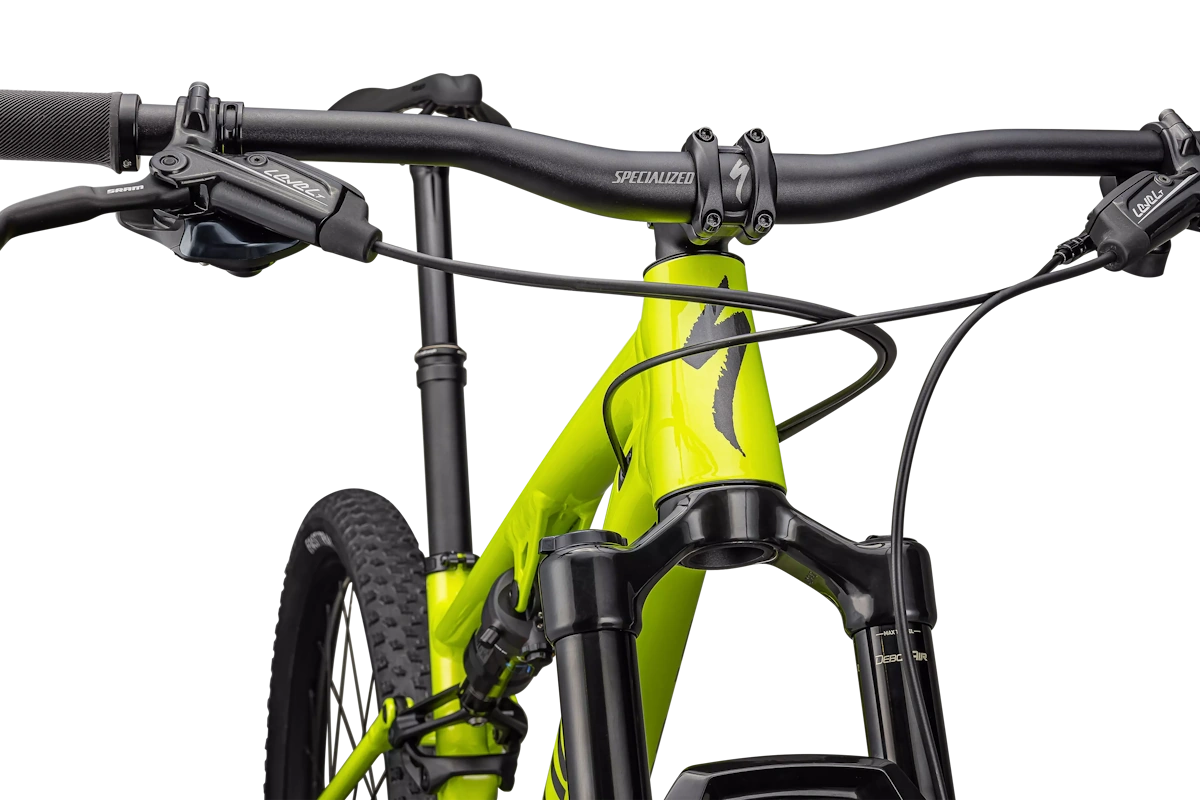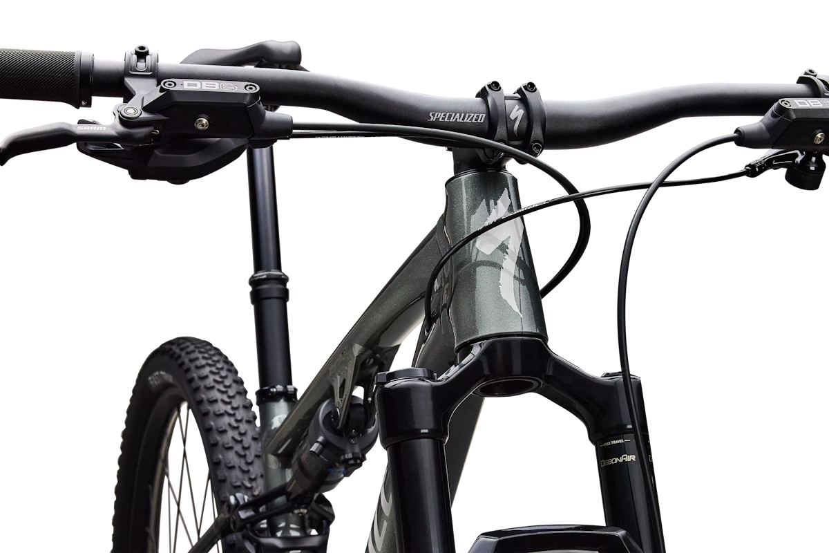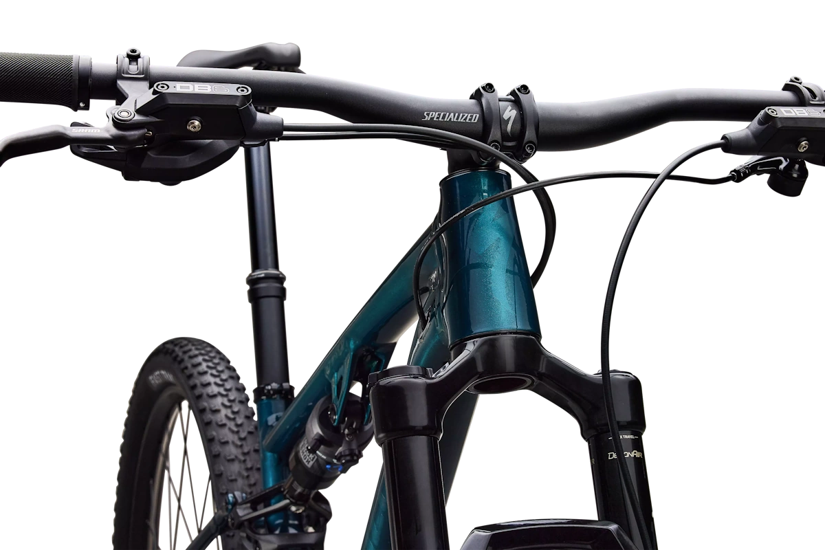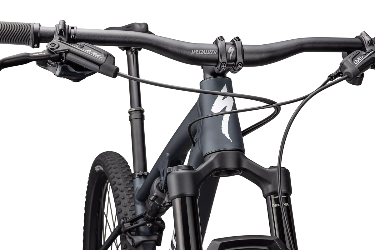 El puesto de mando integra manillar Specialized Alloy de 760 mm con elevación de 20 mm, potencia de aluminio forjado en 3D, puños Specialized Trail Grips y sillín Body Geometry Power Sport. La tija telescópica TranzX adapta su recorrido por talla: