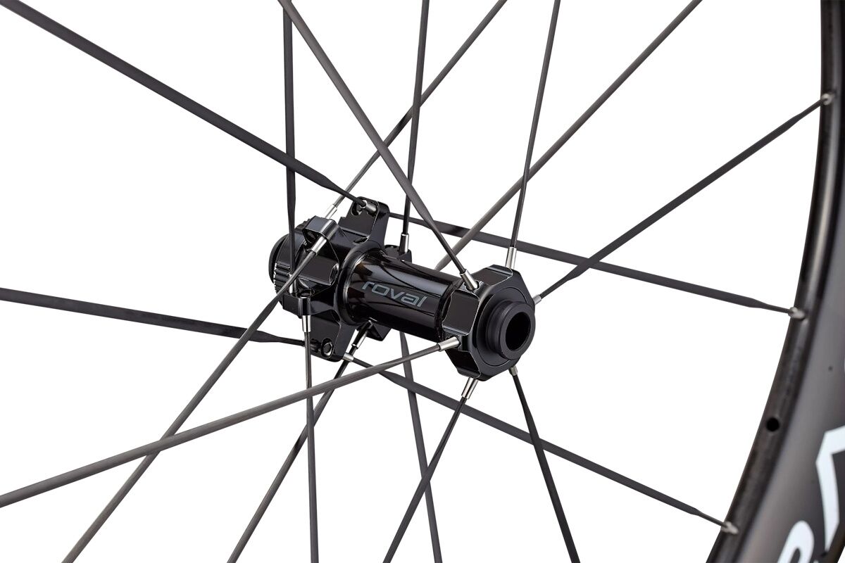 - Tecnología: Llantas de carbono clincher con gancho, compatibles tubeless y mousse, bujes Roval con componentes internos DT Swiss 180 EXP y rodamientos cerámicos DT Sinc.