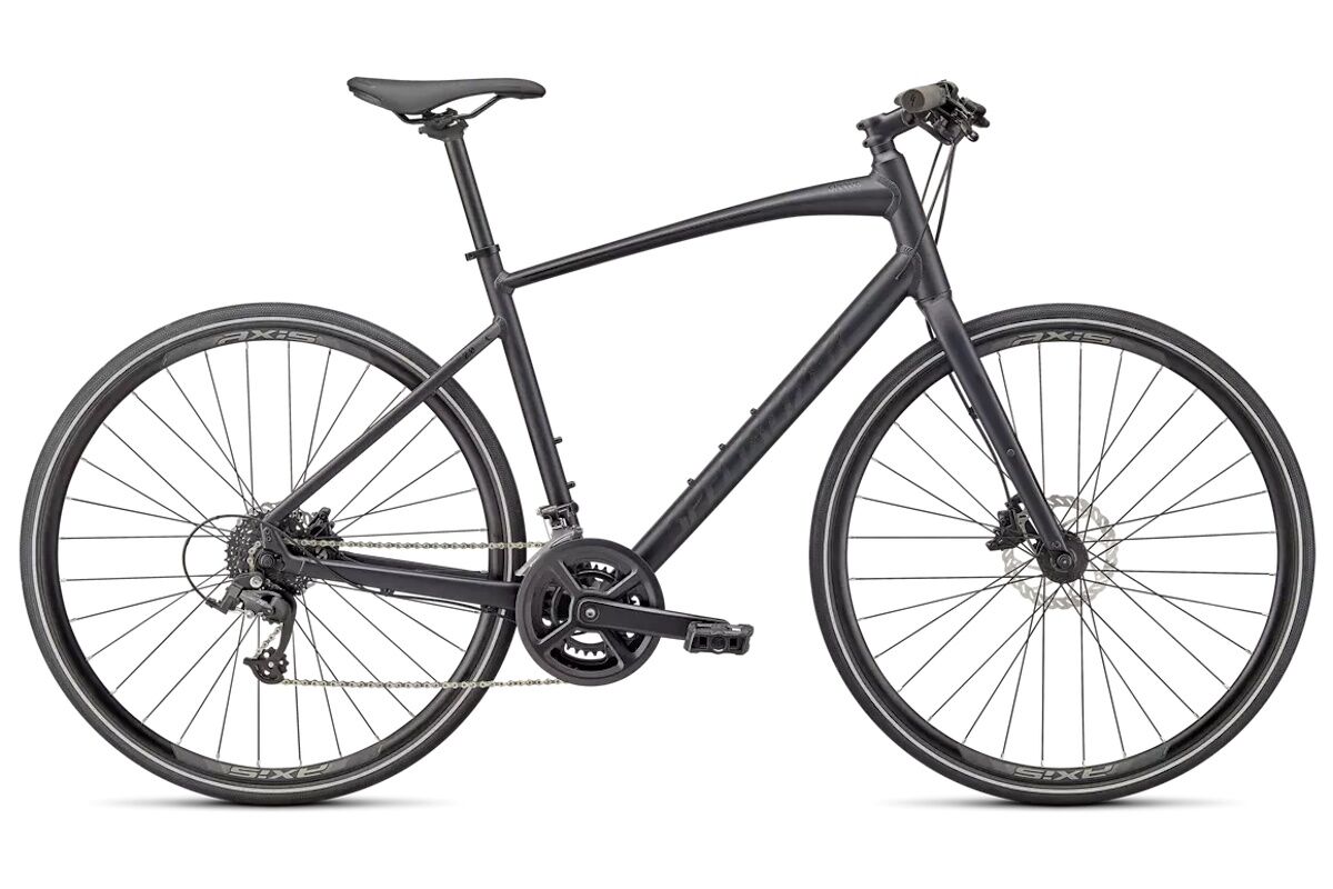 Estructura de aluminio Specialized A1 Premium, geometría de fitness, tubos conificados, enrutamiento interno de cables, montaje plano de disco, liberación rápida, soportes para portaequipajes/defensas Plug + Play