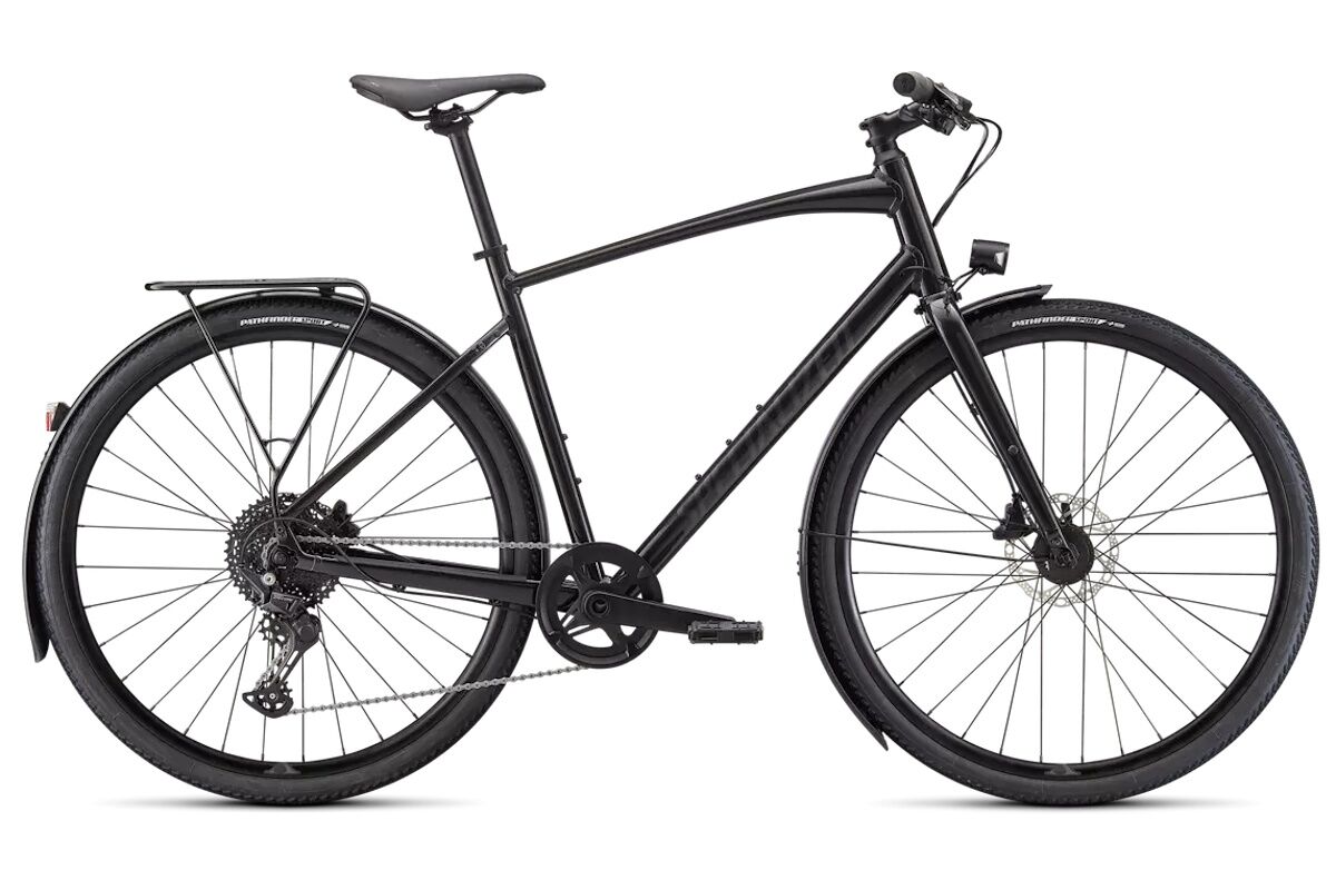 Cuadro: Aluminio premium Specialized A1, geometría Fitness, tubos conificados, cableado interno, soportes para portaequipajes y guardabarros, montaje de freno de disco plano