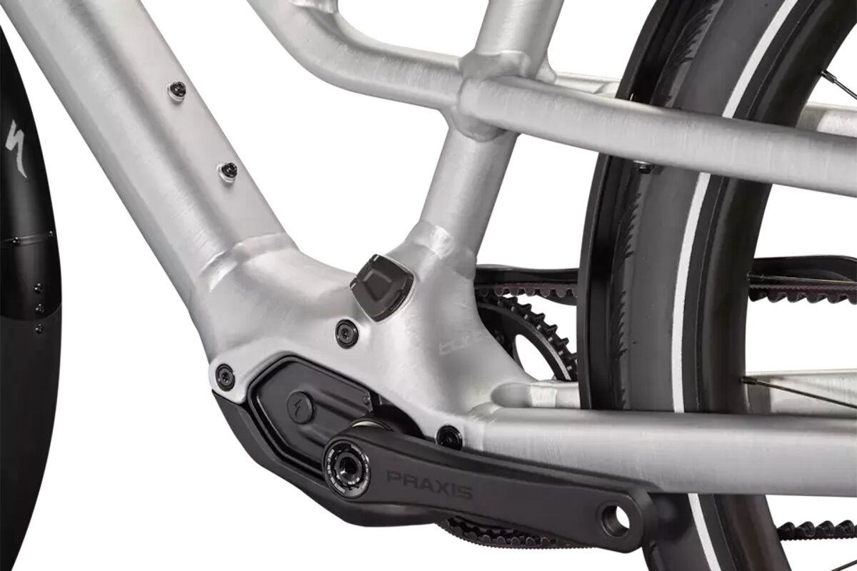 Aluminio E5, soporte del motor del pedalier, batería en el tubo inferior totalmente integrada, cableado interno, soportes para guardabarros y portabultos delantero, Smooth Welds