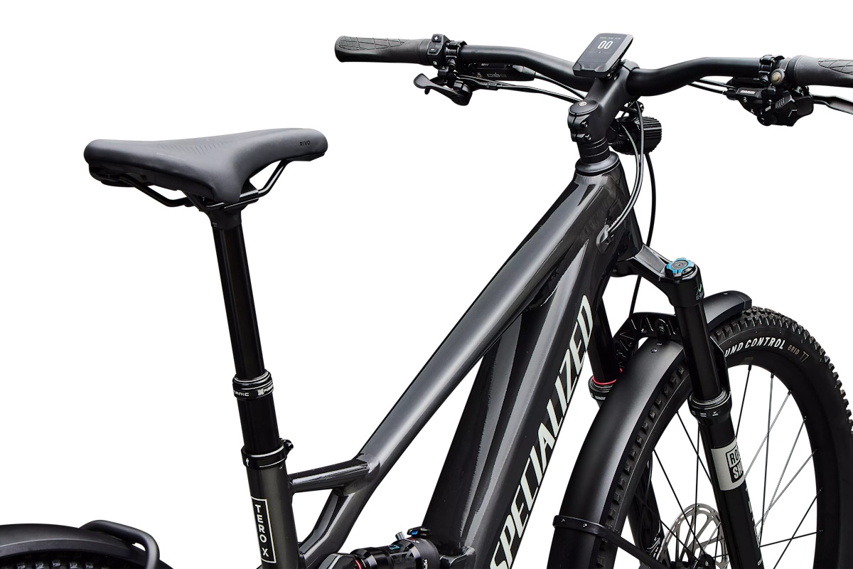 Suave y confiada: Con 130 mm de suspensión delantera (Sram Pyslo Gold) y trasera (RockShox Deluxe Select+), una tija telescópica ajustable X-Fusion Manic y neumáticos Ground Control Grid T7, la Tero X aplana rocas y absorbe baches, garantizando control total en los terrenos más exigentes.