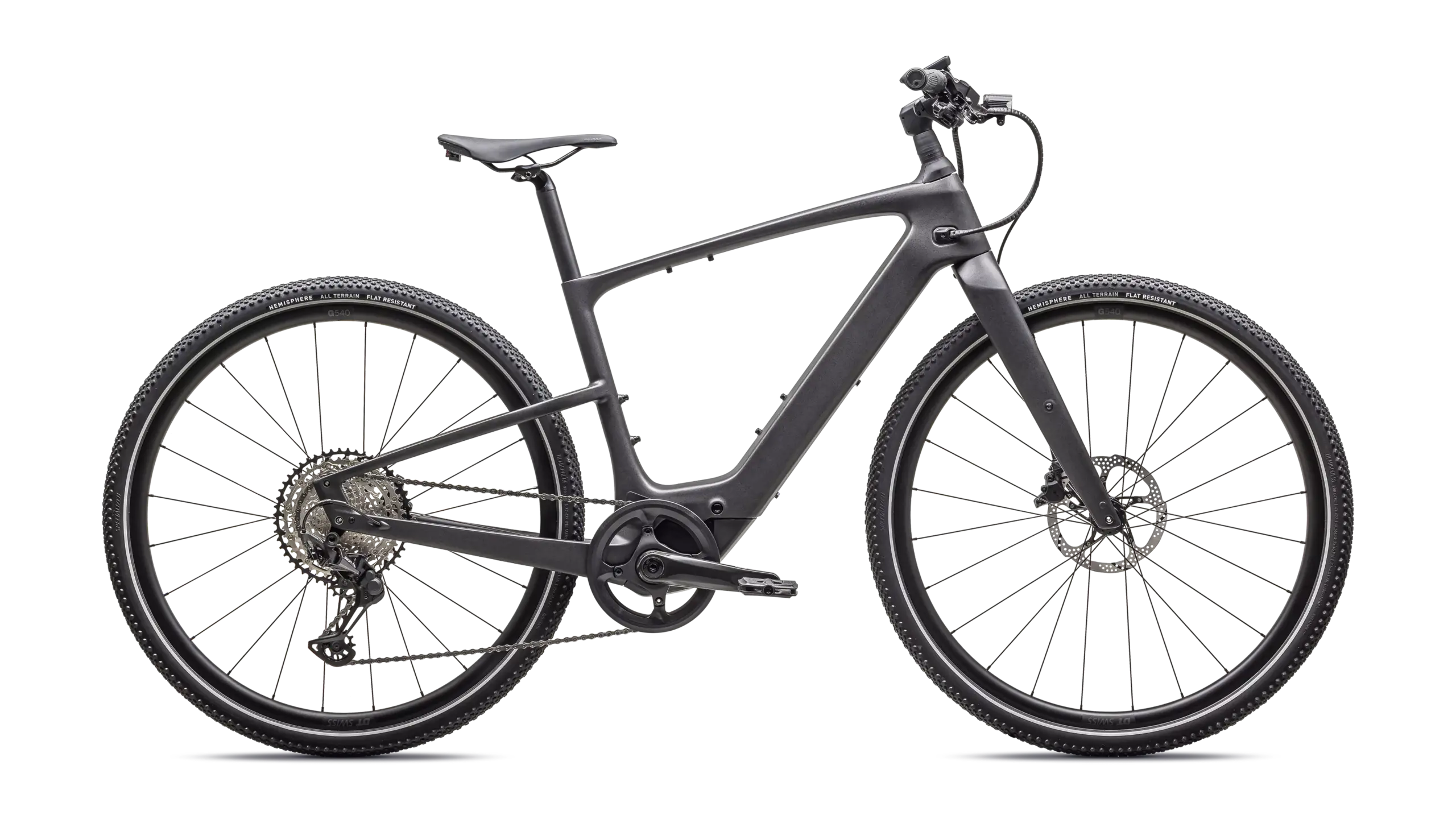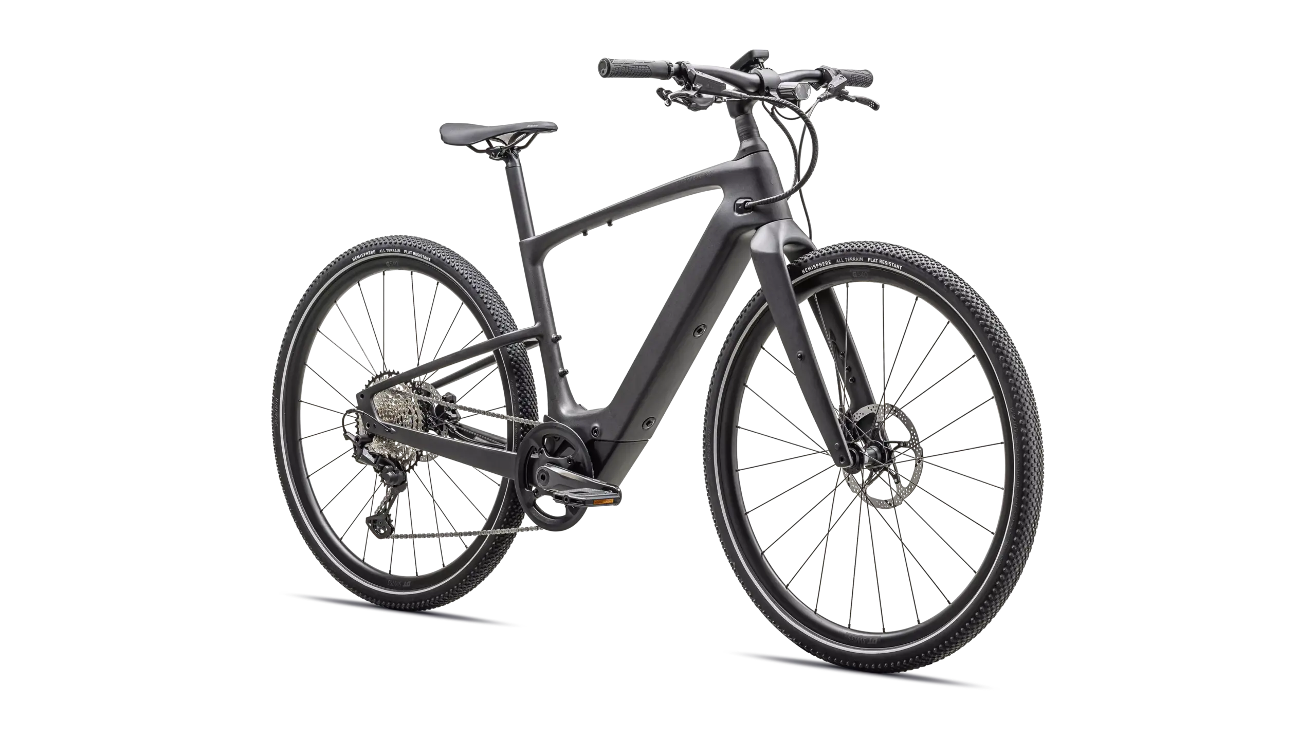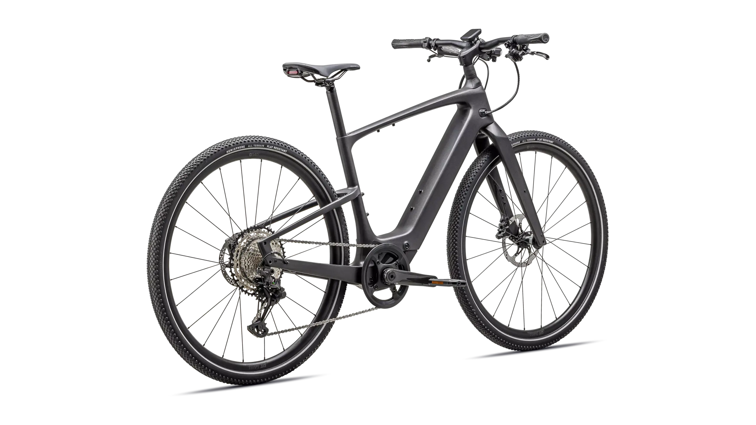 - Neumáticos: Specialized Hemisphere 700x47c, protección antipinchazos, flancos reflectantes → confort, agarre y visibilidad lateral.