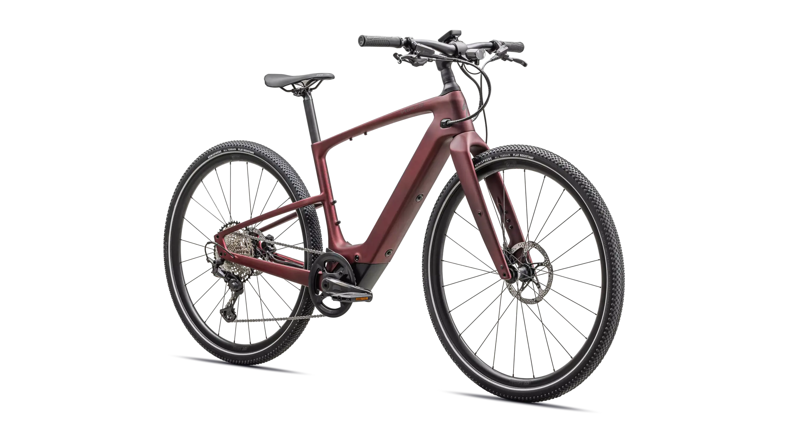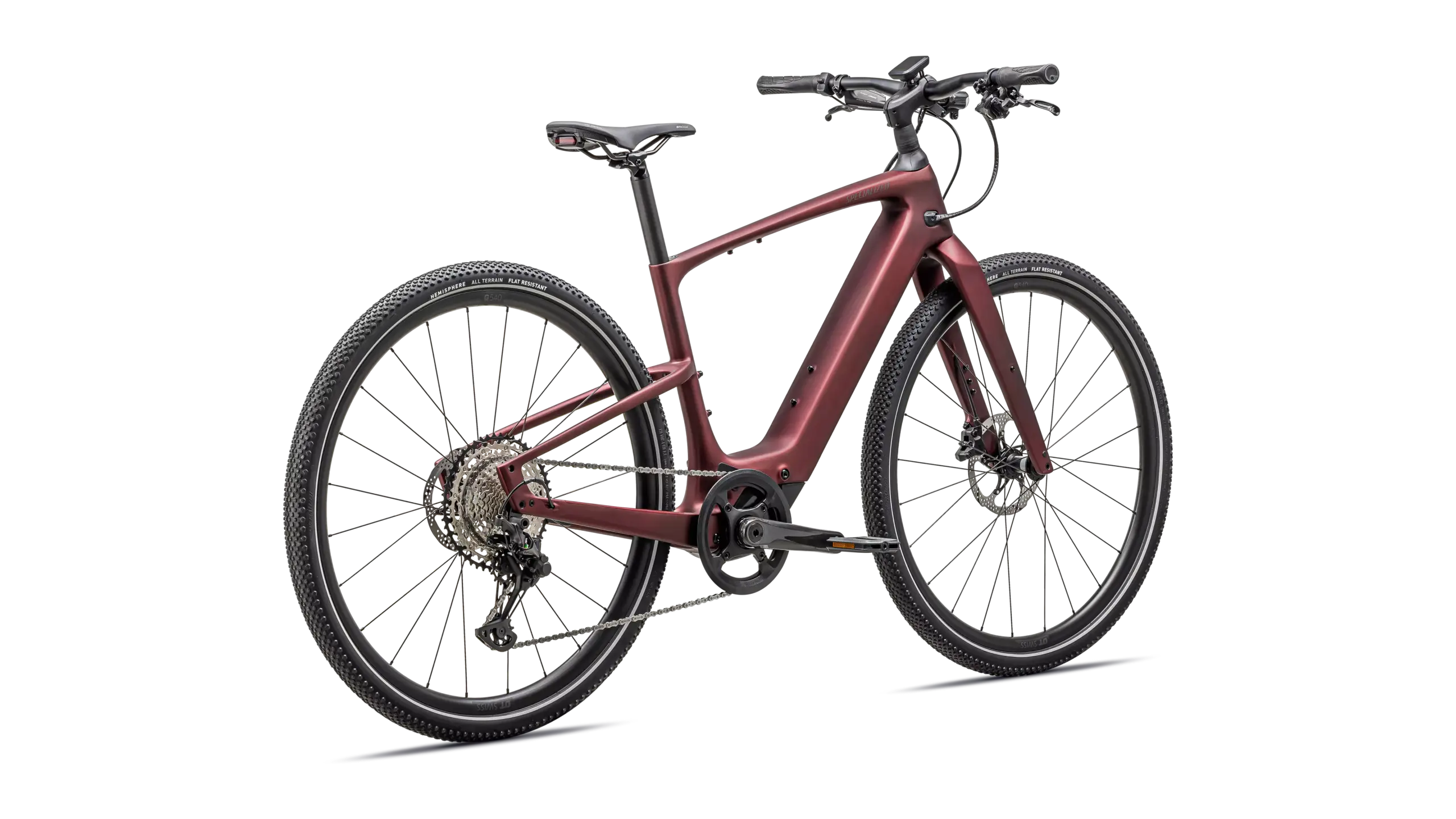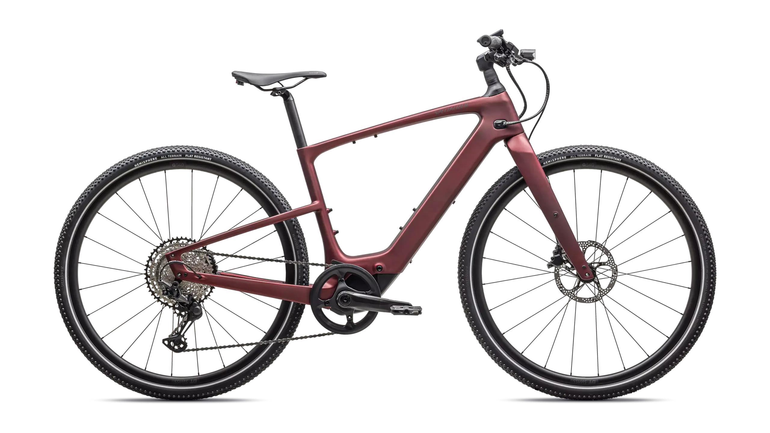 - Neumáticos: Specialized Hemisphere 700x47c, protección antipinchazos, flancos reflectantes → confort, agarre y visibilidad lateral.